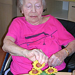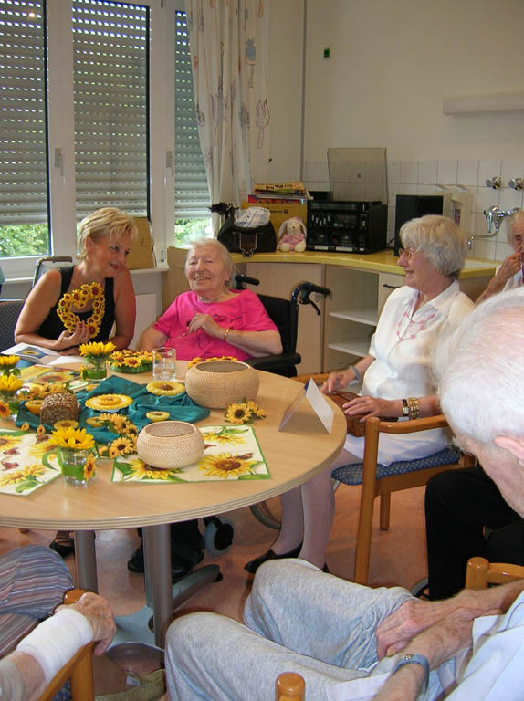 Die Bewohner dekorieren mit der Beschäftigungstherapeutin einen Tisch und das Zimmer mit Sonnenblumen, essen Sonnenblumenkernbrot und naschen geröstete Sonnenblumenkerne. Sie erfahren gemeinsam etwas über die Herkunft der Sonnenblume, hören und lesen Sonnenblumengedichte und basteln Kränze aus Sonnenblumen.