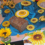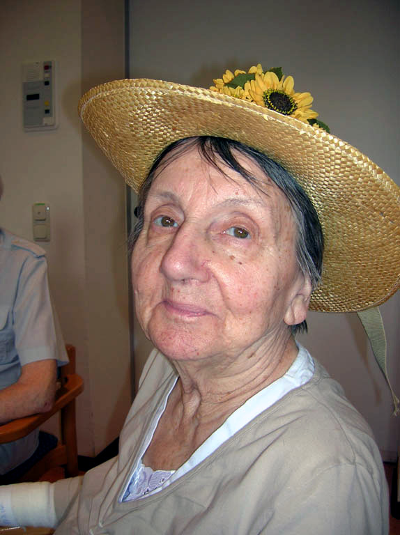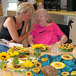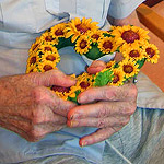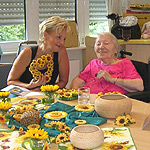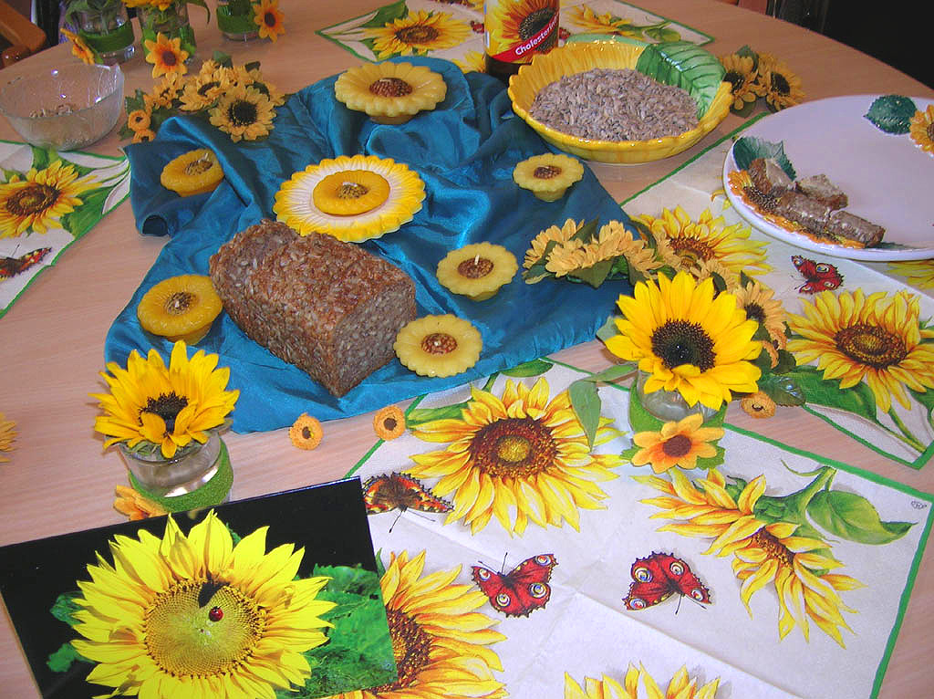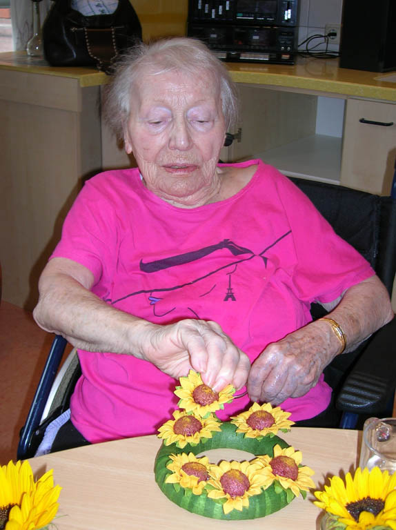 Die Bewohner dekorieren mit der Beschäftigungstherapeutin einen Tisch und das Zimmer mit Sonnenblumen, essen Sonnenblumenkernbrot und naschen geröstete Sonnenblumenkerne. Sie erfahren gemeinsam etwas über die Herkunft der Sonnenblume, hören und lesen Sonnenblumengedichte und basteln Kränze aus Sonnenblumen.